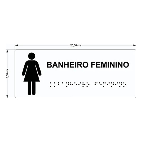 Placa Braile PVC Pictograma Feminino 15x15cm, com escrita em braile e alto-relevo, garantindo acessibilidade, identificação e durabilidade em banheiros e vestiários.
