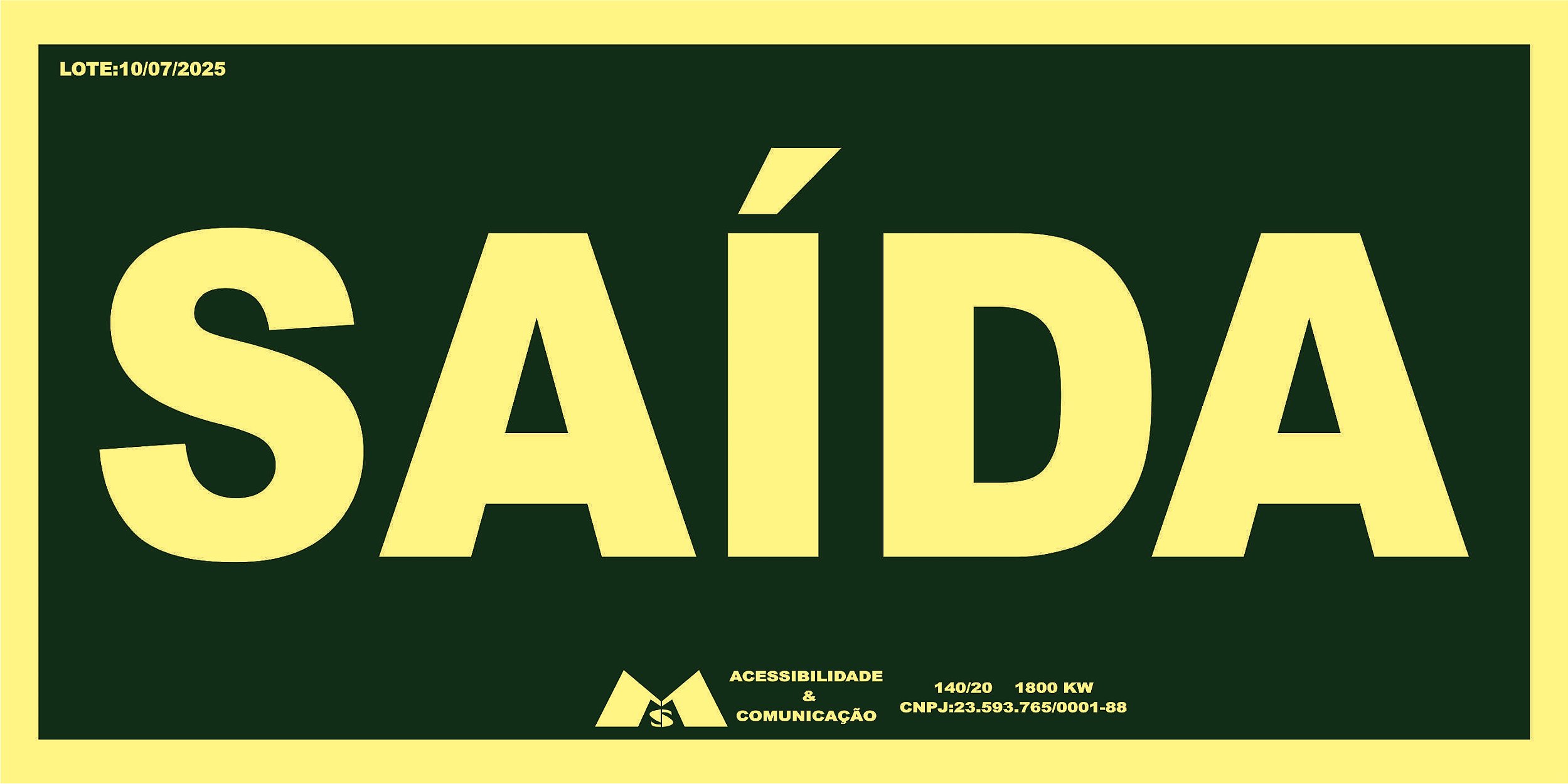 Placa de Sinalização Fotoluminescente de Emergência- Saída, S12 em PS 1mm, medida 20x10 cm.