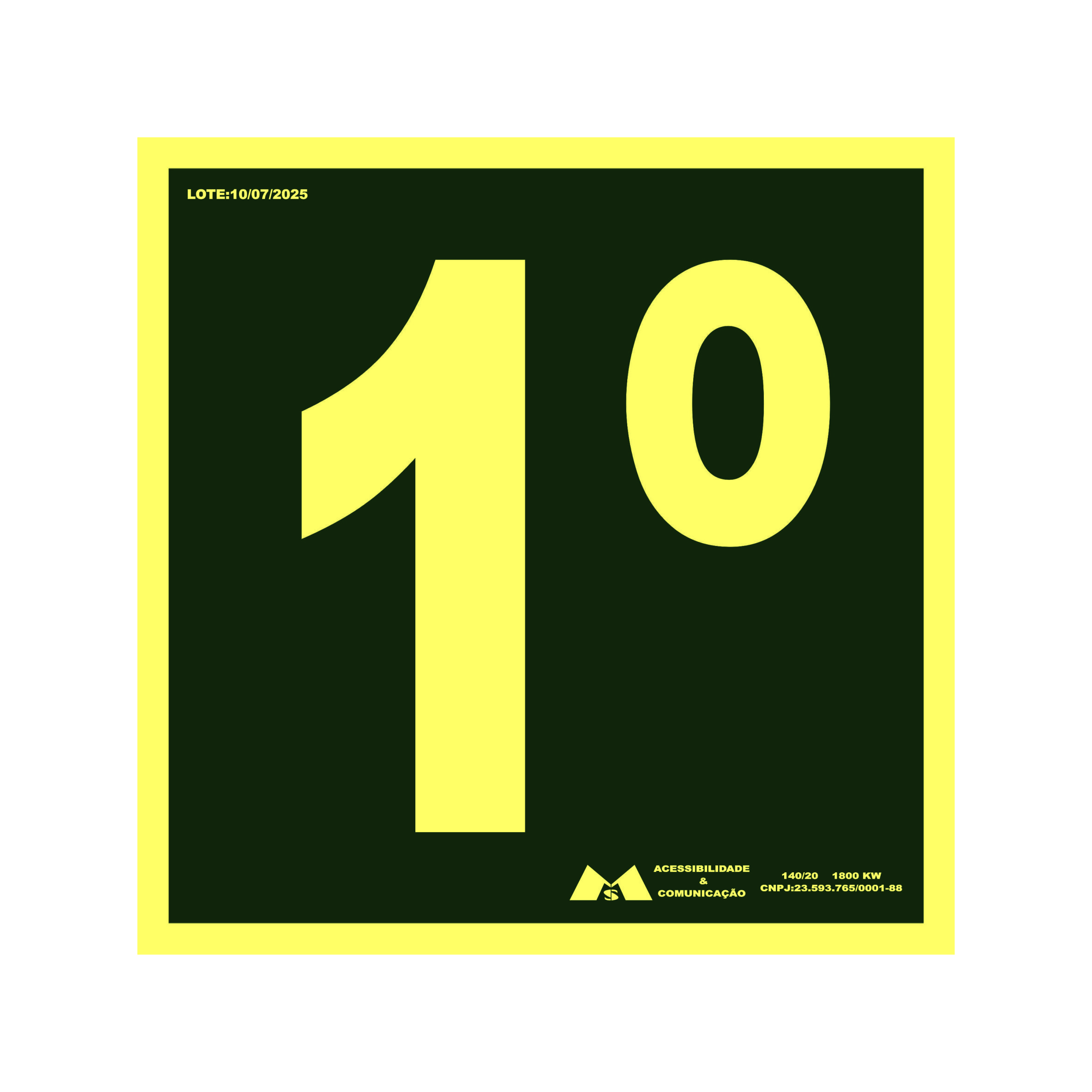 Placa de Sinalização Fotoluminescente “1º Andar” 20x20 cm – Produzida em PVC expandido 2 mm com propriedade ANTI-CHAMAS, oferece identificação clara do andar com alta visibilidade, mesmo em ausência de luz.