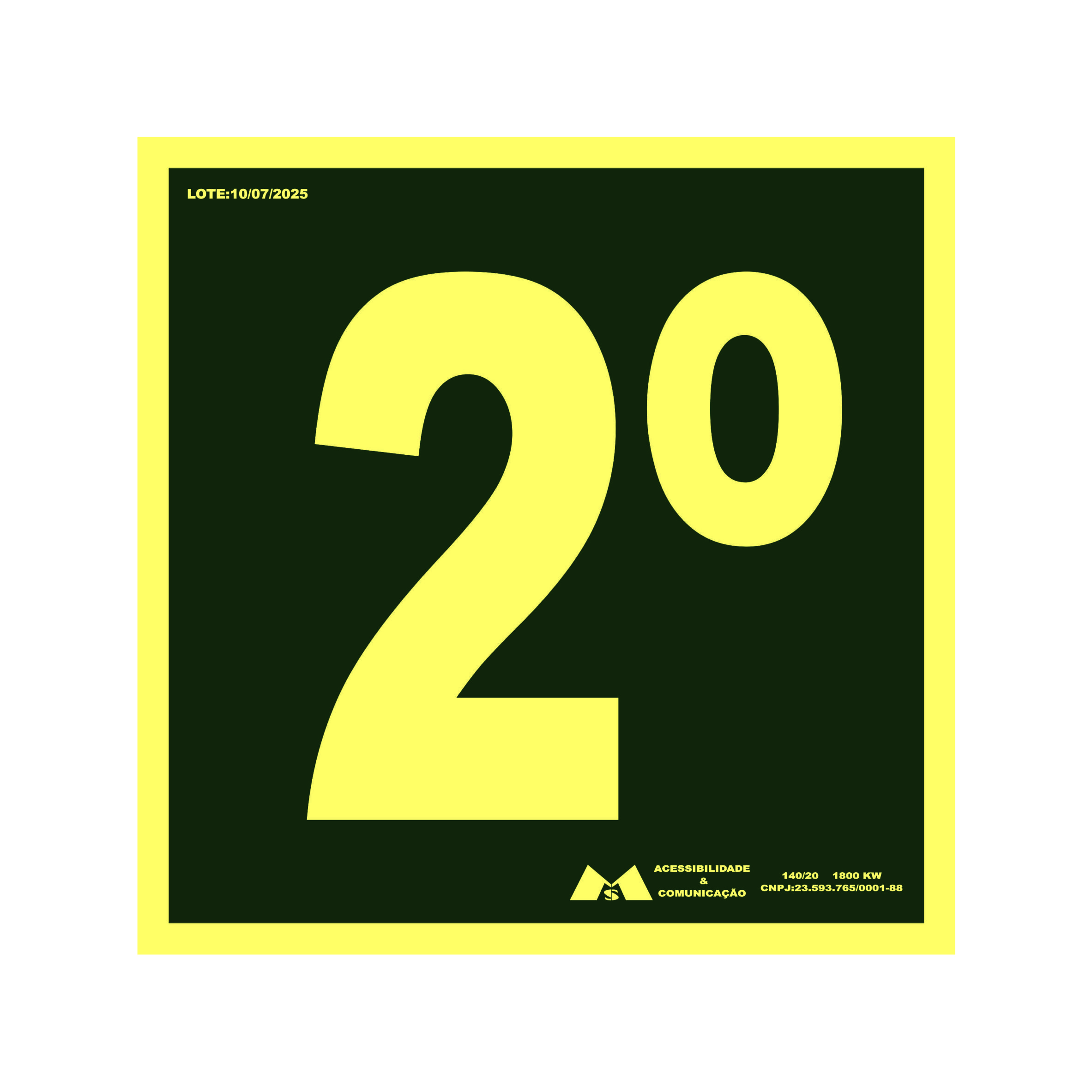 Placa de Sinalização Fotoluminescente “2º Andar” 20x20 cm – Produzida em PVC expandido 2 mm com propriedade ANTI-CHAMAS, oferece identificação clara do andar com alta visibilidade, mesmo em ausência de luz.