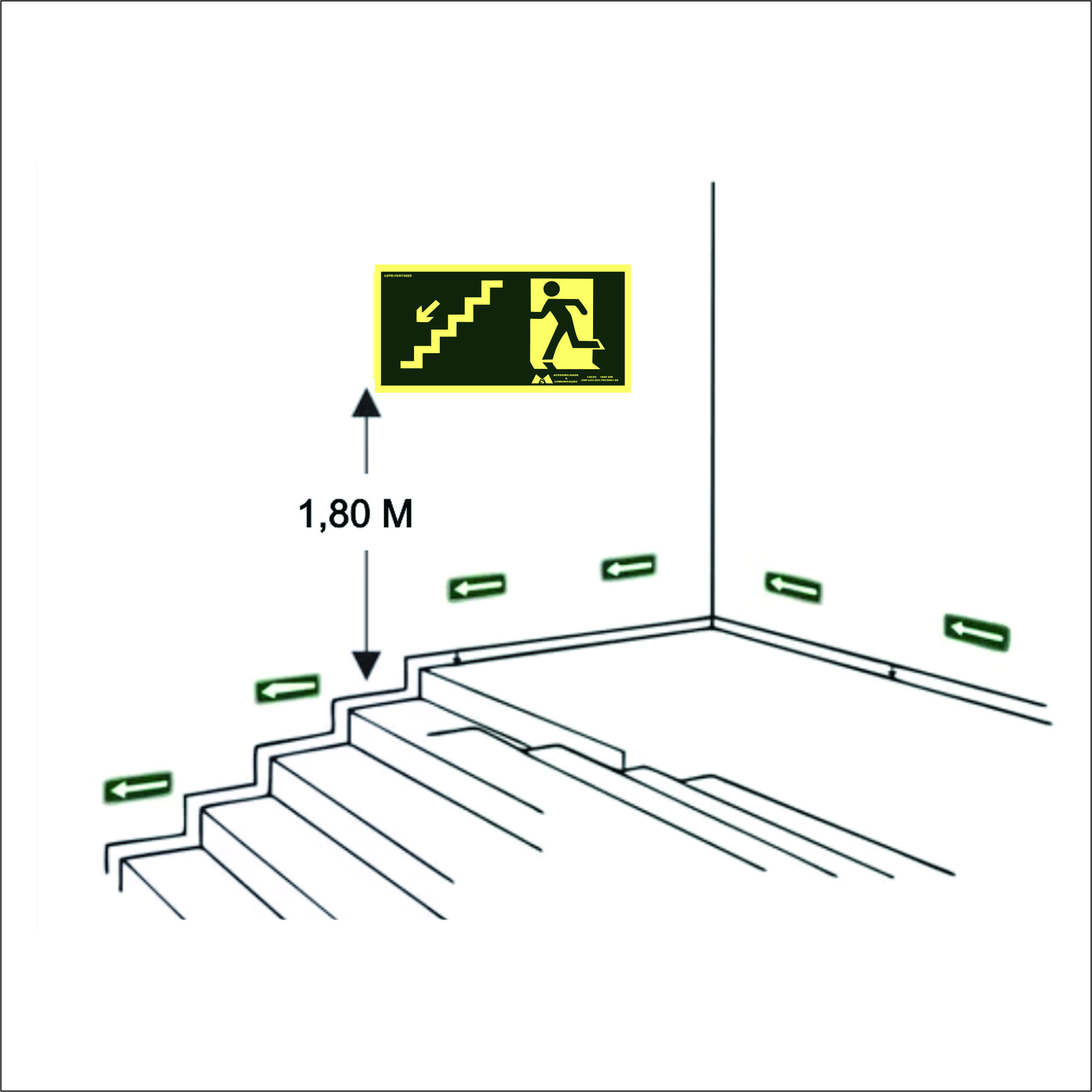 Produzida em PS 1 mm, garante identificação clara da rota de fuga com alta visibilidade, mesmo em ausência de luz.